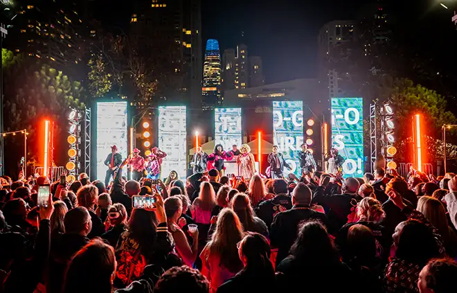 For Yerba Buena Gardens' stage and dance floor setup, the crew incorporated Maverick Storm 2 BeamWash fixtures, ACME Pixel Line fixtures, LED panels, and a steel deck package.