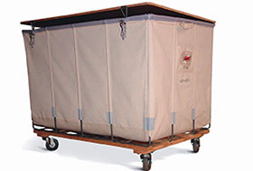 Heavyweight canvas hampers with hinged wooden tops, reinforced bottoms and swivel casters. Ideal for soft goods storage and moving.