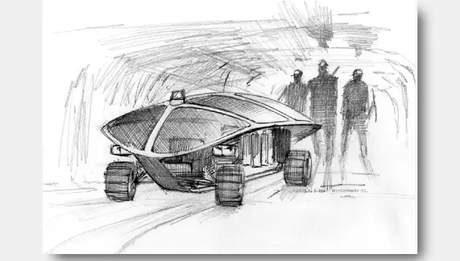 This all wheel drive, Bluetooth controlled vehicle, follows Coal Miners like a dog but with a "tortoise shell" to duck under and supplies for 3 days.