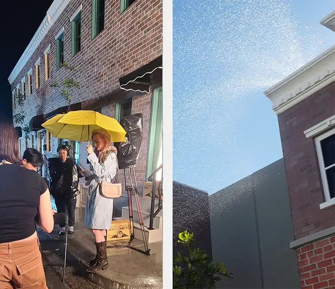 In addition to functional doors and real concrete sidewalks, the backlot features a fully integrated rain FX system covering the entire street. The system is divided into nine independently controlled sections, allowing rain to be deployed selectively for precise storytelling, lighting control, and safety.