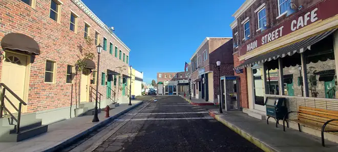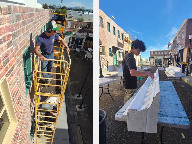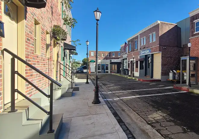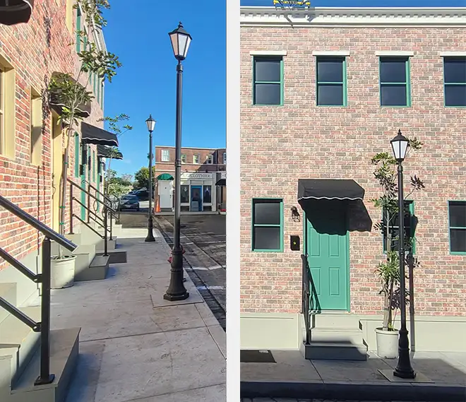 To ground the sets physically and visually, a poured concrete sidewalk was installed in front of the facades. Real concrete provides authentic texture, reflections, sound response, and wear subtle details that the camera instinctively recognizes.